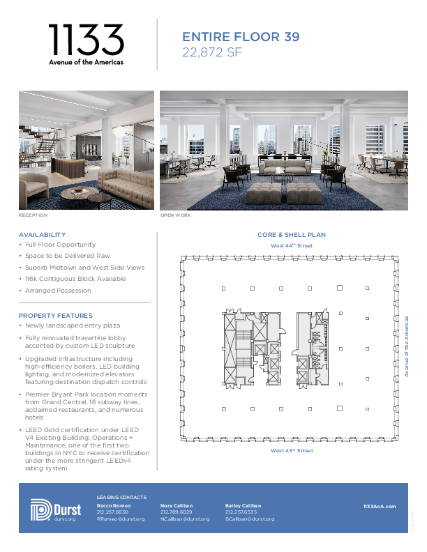With its limestone façade and sleek modernist lines, 1133 Avenue of the Americas led the transformation of Sixth Avenue into a global business hub. Located between 43rd and 44th streets, the tower maintains a distinctive presence overlooking Bryant Park. Highlights of a $10 million building enhancement program include a stunning lobby refurbishment, destination dispatch elevator controls, turnstile system, new elevator cab interiors, a dramatic LED art installation, and green roofs.