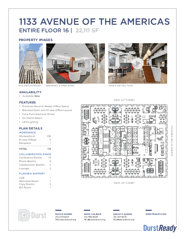 With its limestone façade and sleek modernist lines, 1133 Avenue of the Americas led the transformation of Sixth Avenue into a global business hub. Located between 43rd and 44th streets, the tower maintains a distinctive presence overlooking Bryant Park. Highlights of a $10 million building enhancement program include a stunning lobby refurbishment, destination dispatch elevator controls, turnstile system, new elevator cab interiors, a dramatic LED art installation, and green roofs.