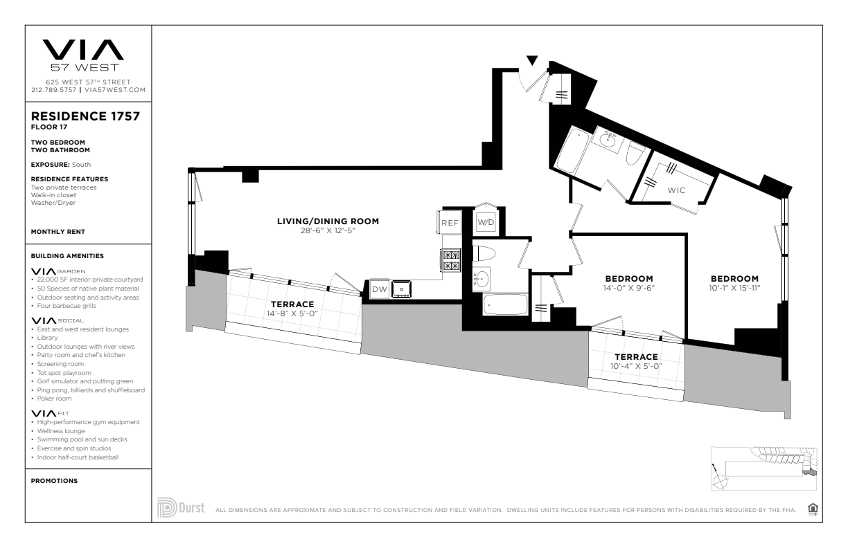 Designed by award-winning Bjarke Ingles Group, VIA 57 WEST offers a range of studio, one, two, three, and four-bedroom residences, many with private terraces. Spacious apartments, expansive amenities and a lush private resident courtyard balance the vibrant energy of Manhattan with the tranquility of nature, creating an iconic and visual gateway to New York. Unparalleled amenities, sophisticated fitness facilities, a 25-yard pool, and a central garden oasis enhance the living experience and wellbeing of VIA residents. Thoughtfully-curated resident programming and community events provide opportunities for residents to enjoy social interaction and an enhanced lifestyle. VIA 57 WEST’s human-centered approach blends environmental responsibility with resident wellness. All materials and construction techniques are carefully considered for resiliency, global impact and contribution to the health and productivity of our residents.